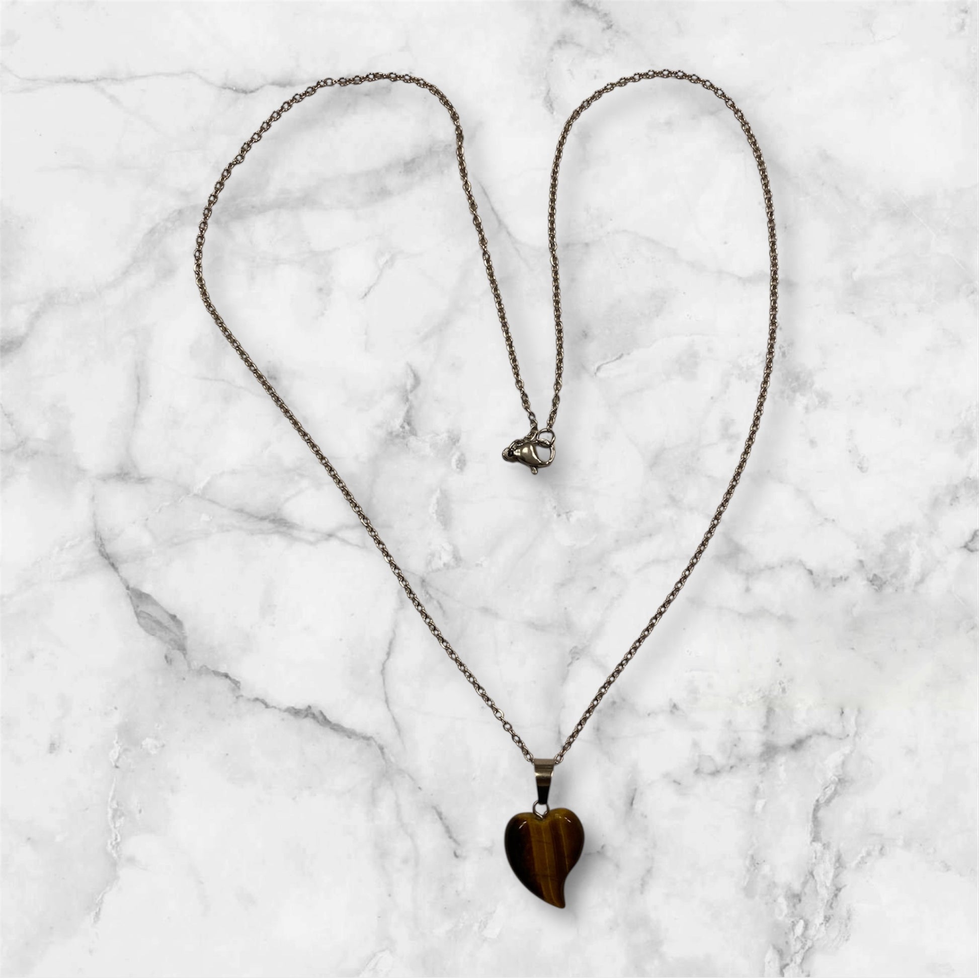 Halsband med hjärthänge i ädelstenen Tigeröga. Tigeröga är bildad av små utväxter av morganit och kvarts. Eftersom den är en metamorf bergart har den vackra nyanser av rödbrun med järnränder. Åratal av naturliga processer och jordens kraft har gjort den till en mycket kraftfull ädelsten.