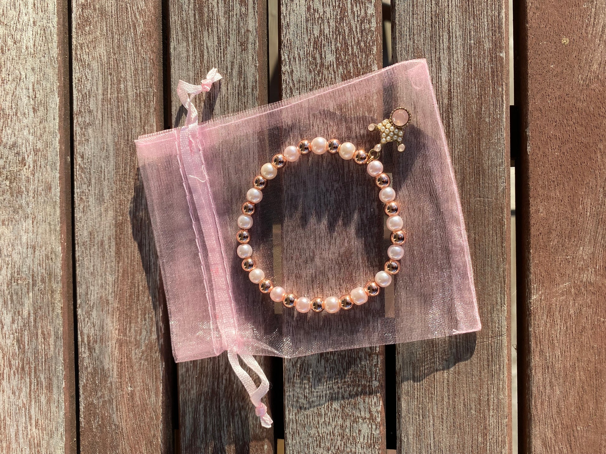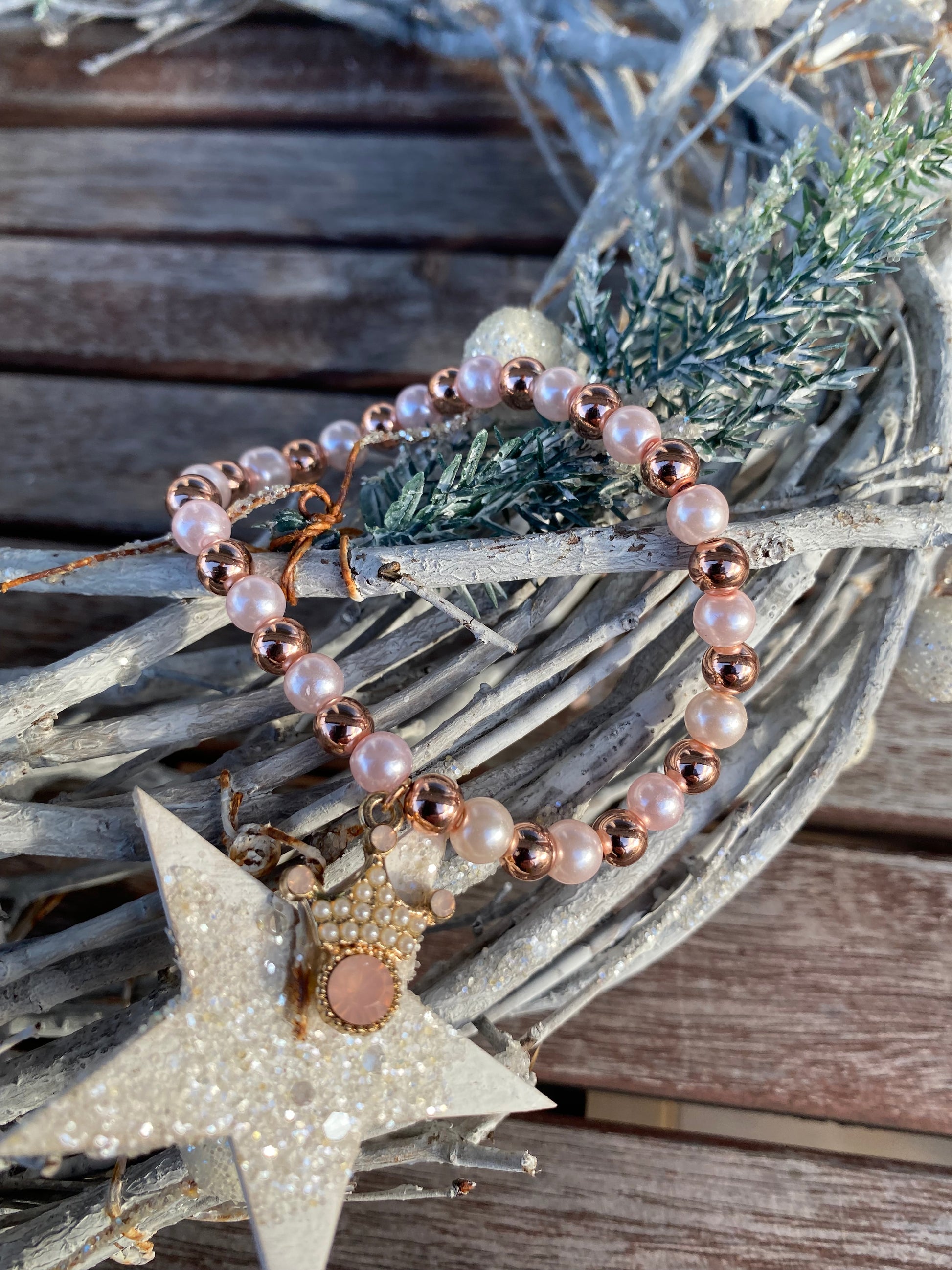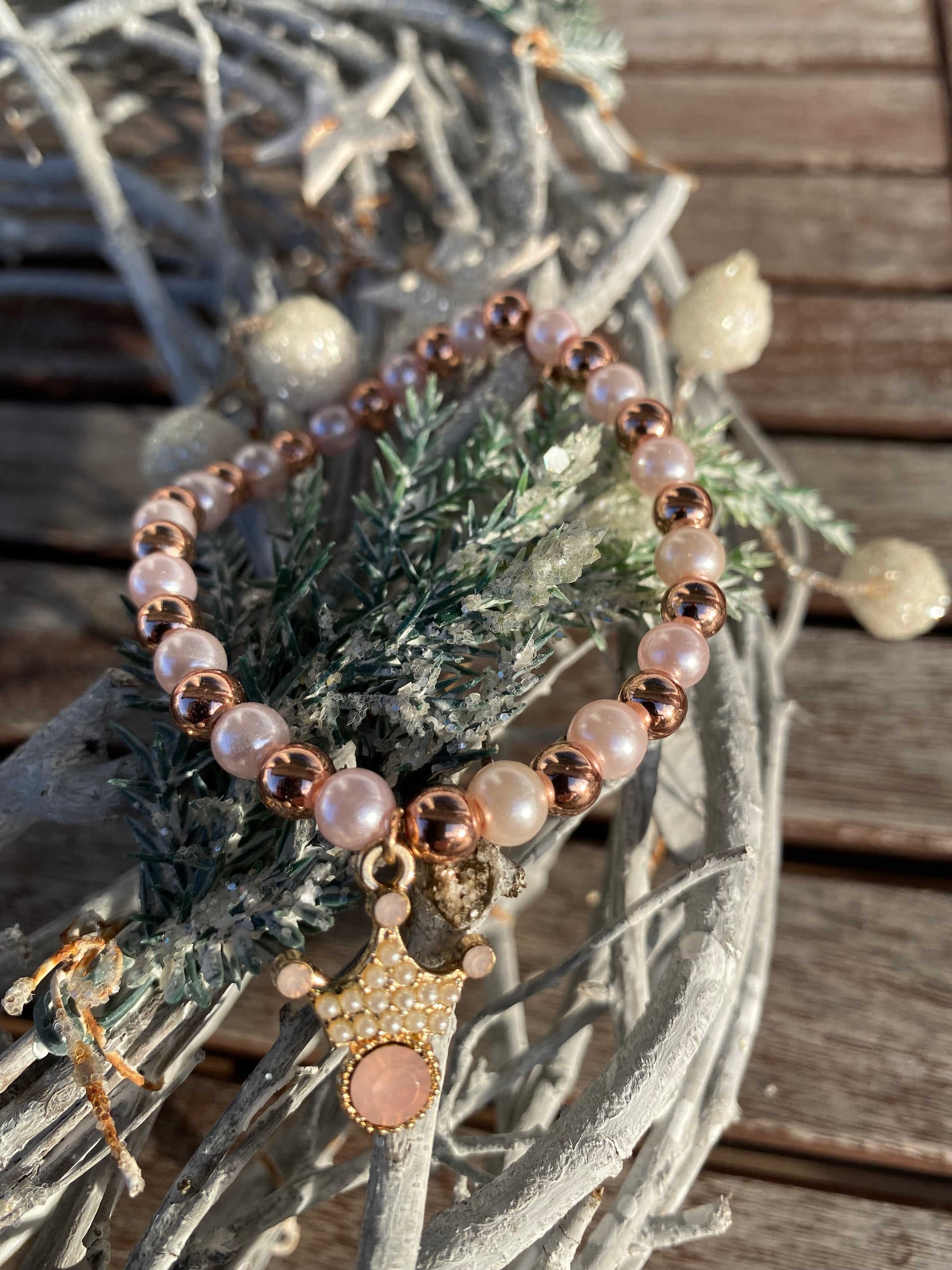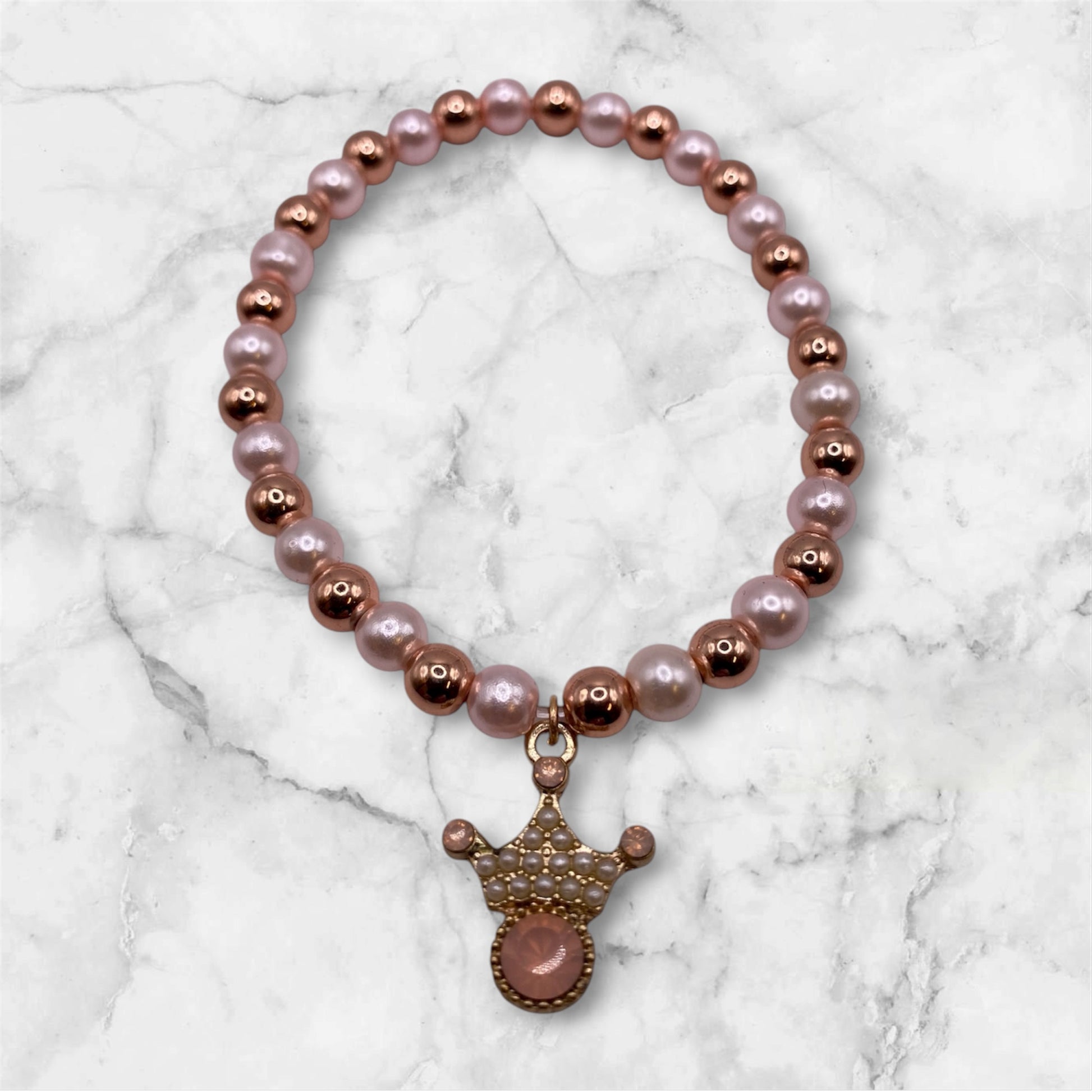 Pärlarmband med strasskrona och ljusrosa glaspärlor och roséfärgade metallpärlor.