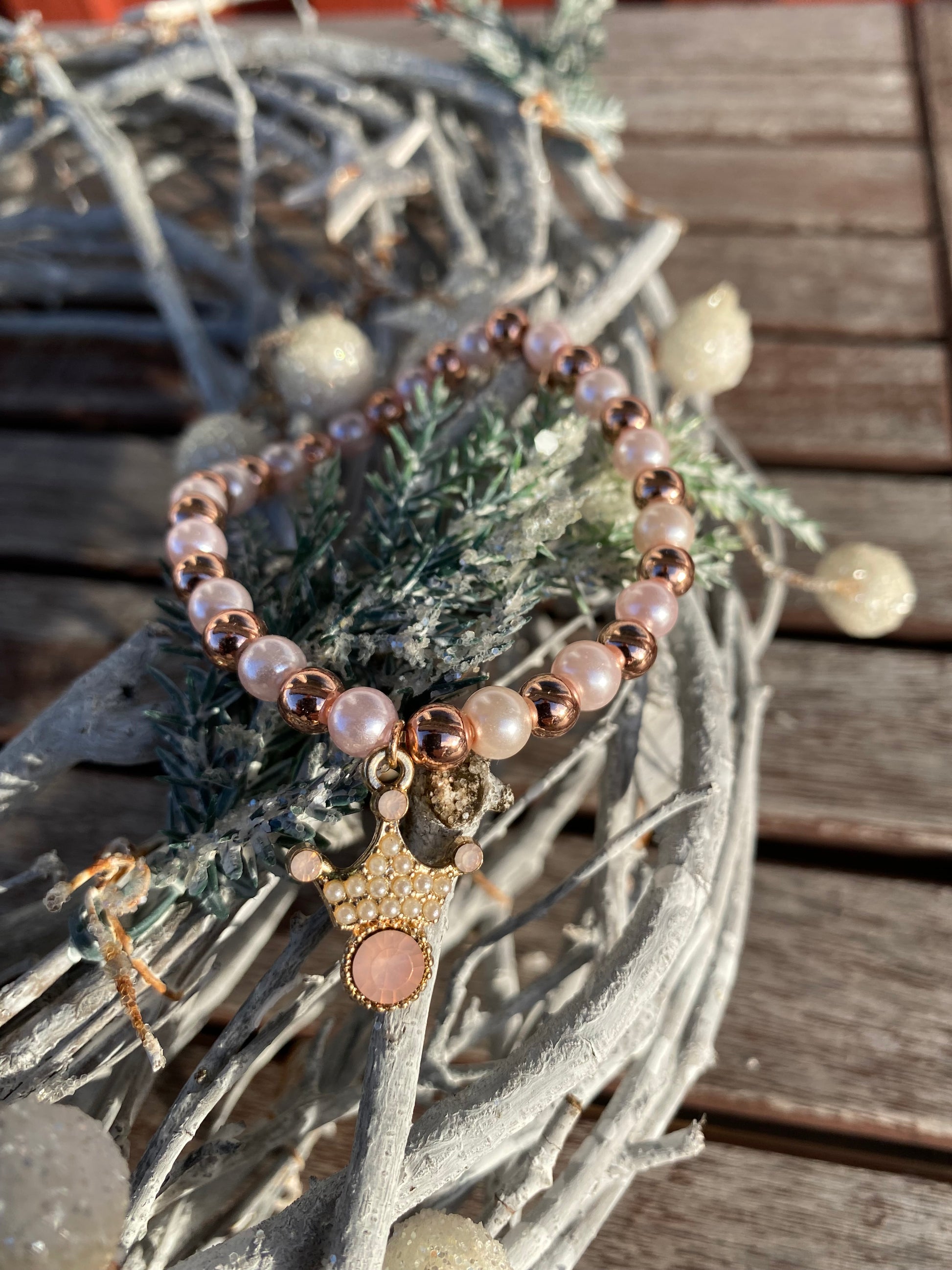 Pärlarmband med strasskrona och ljusrosa och roséfärgade pärlor