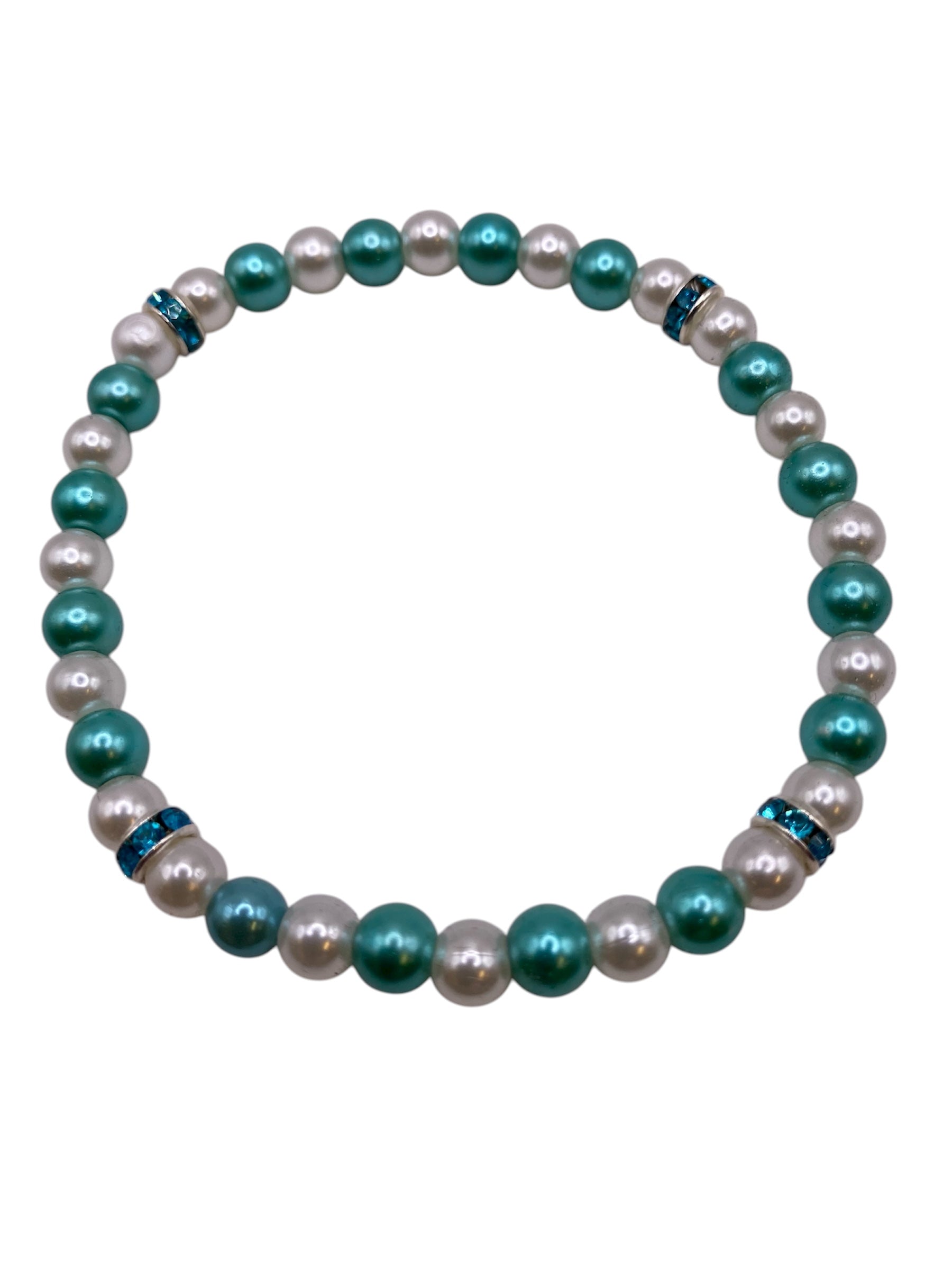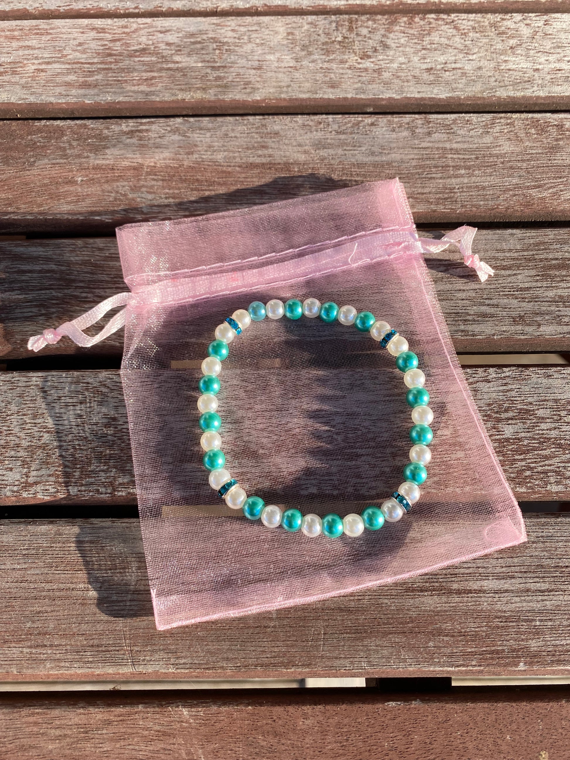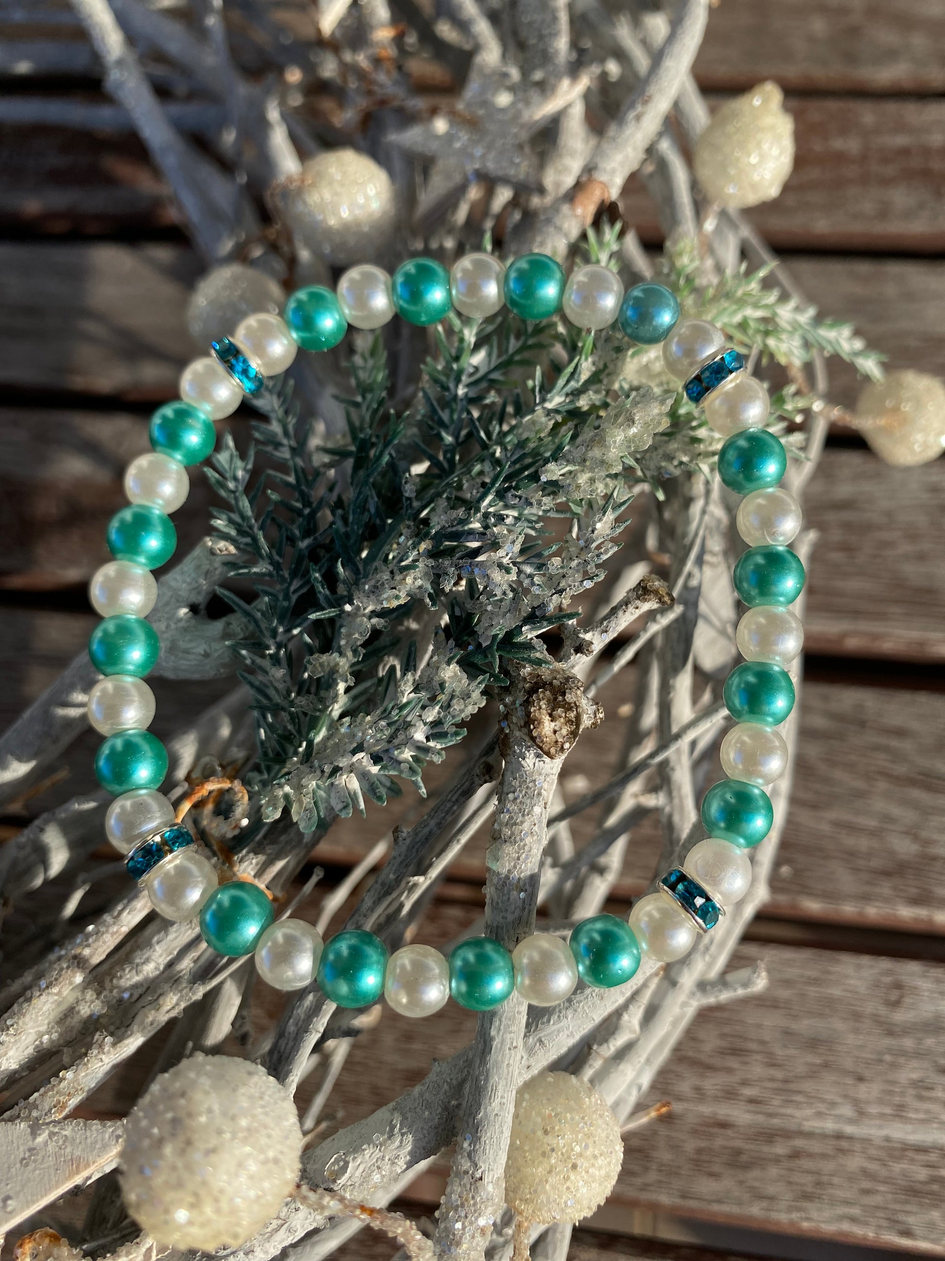 Pärlarmband med vita och turkosa vaxade glaspärlor och turkosa strasstenar.