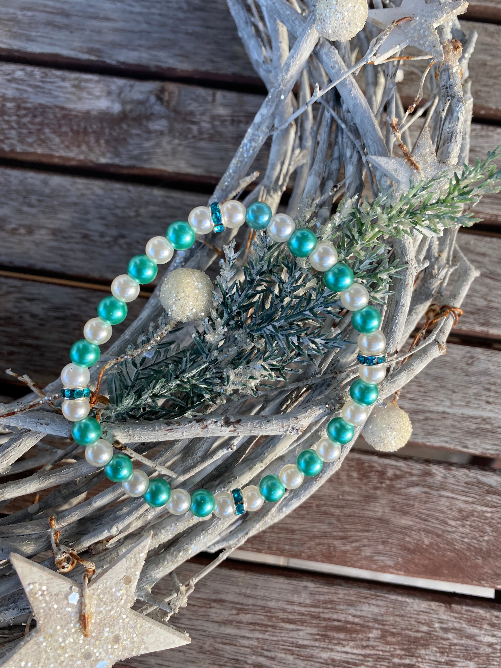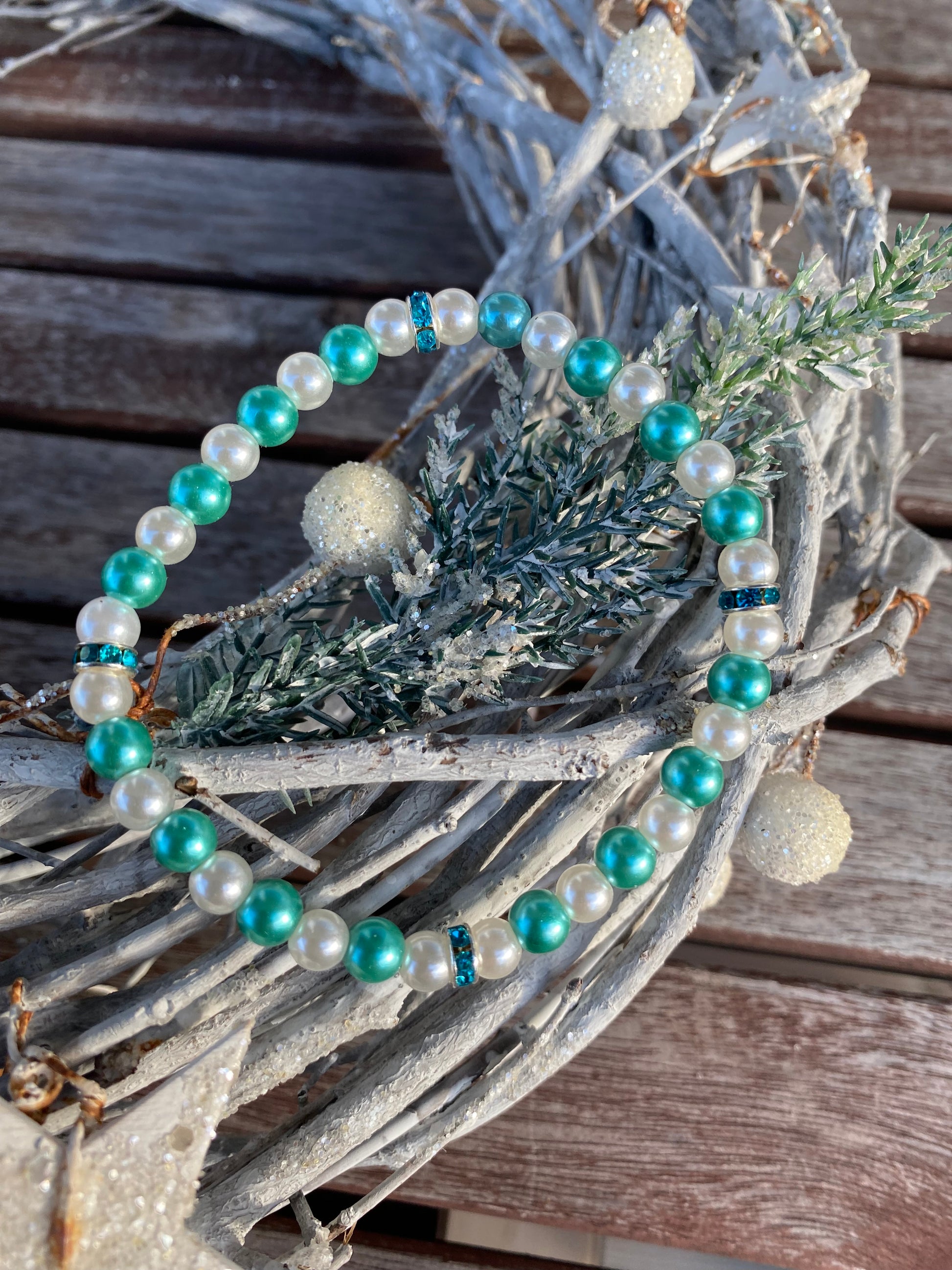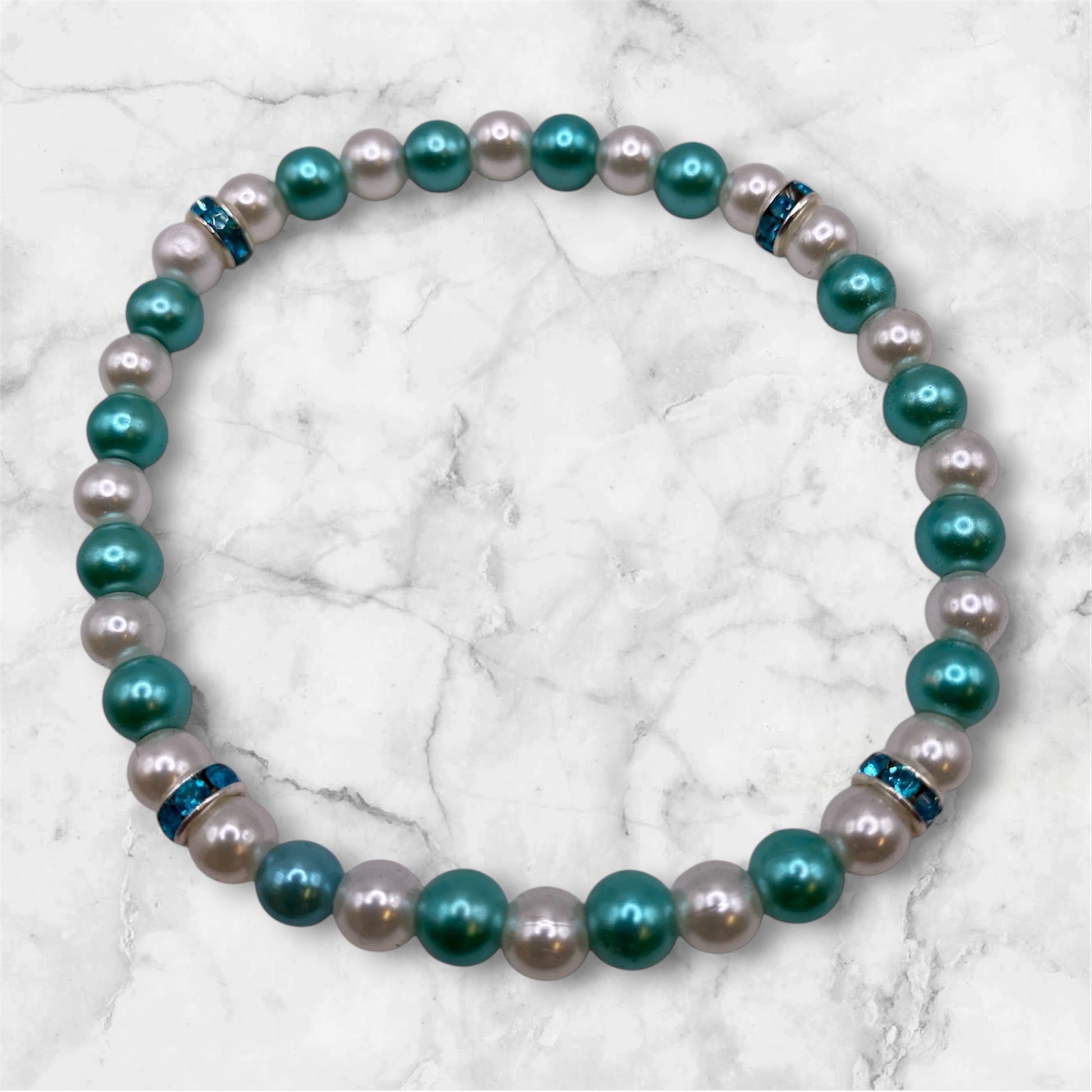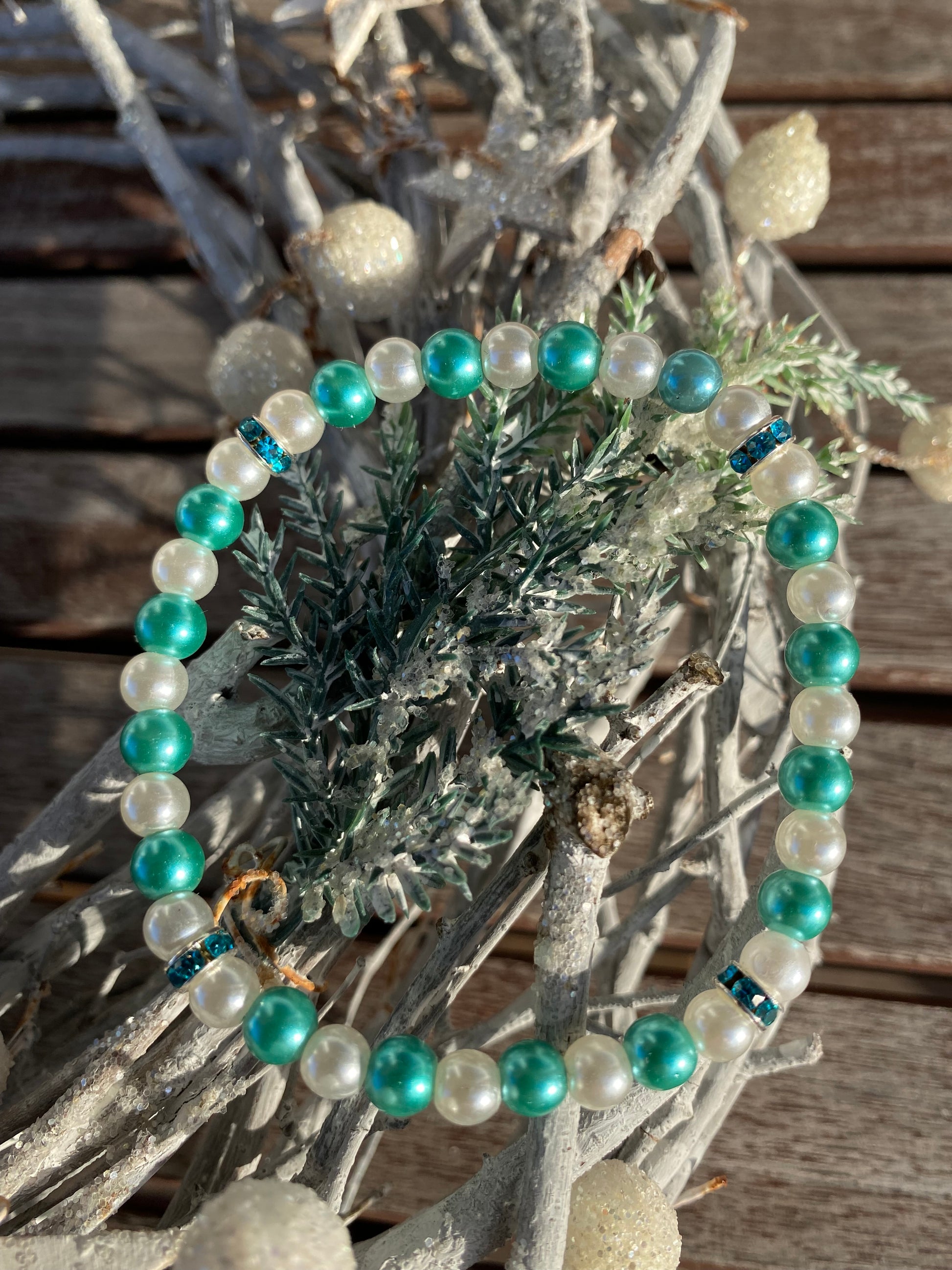 Pärlarmband med vita och turkosa vaxade glaspärlor och turkosa strasstenar.