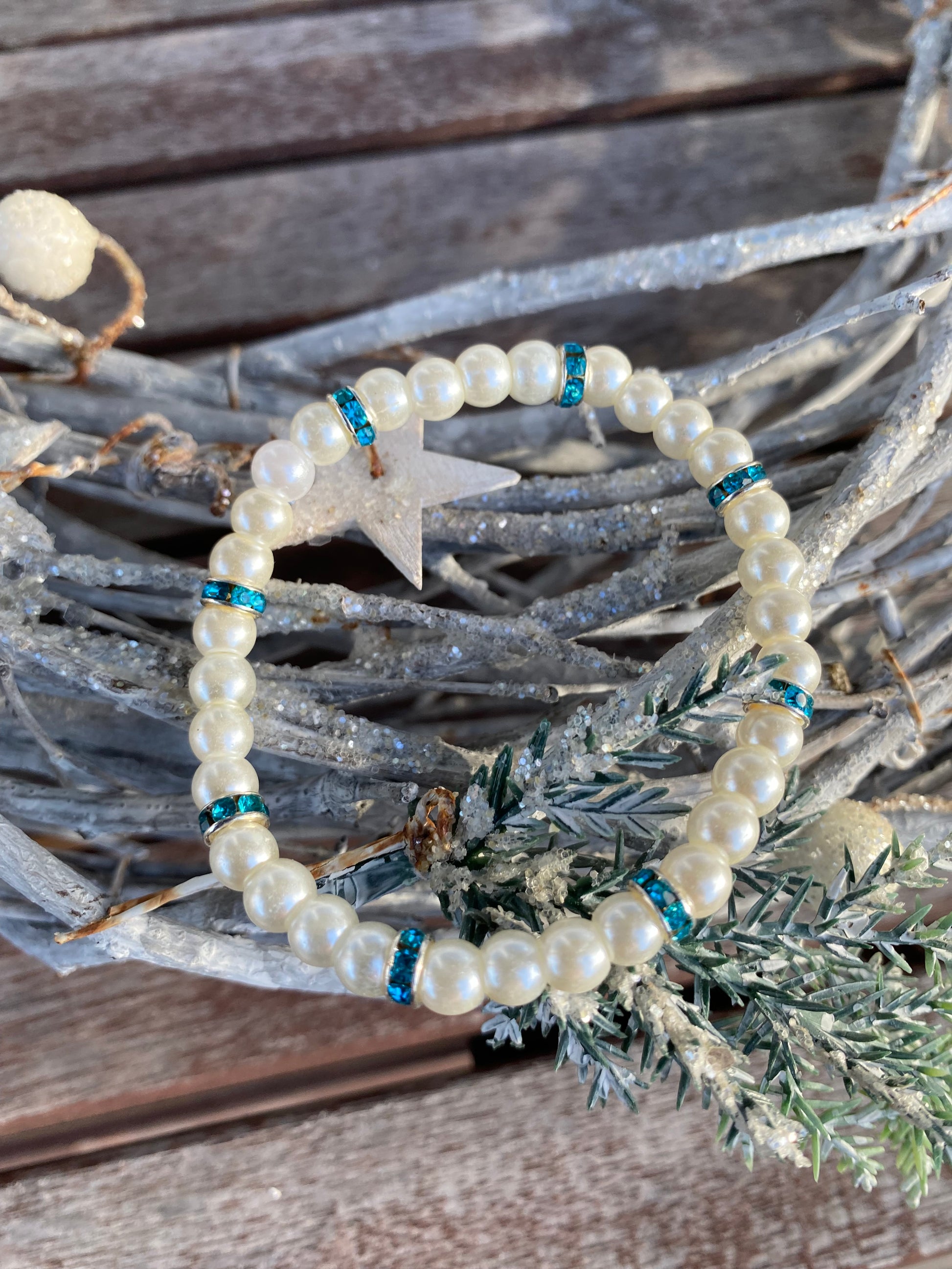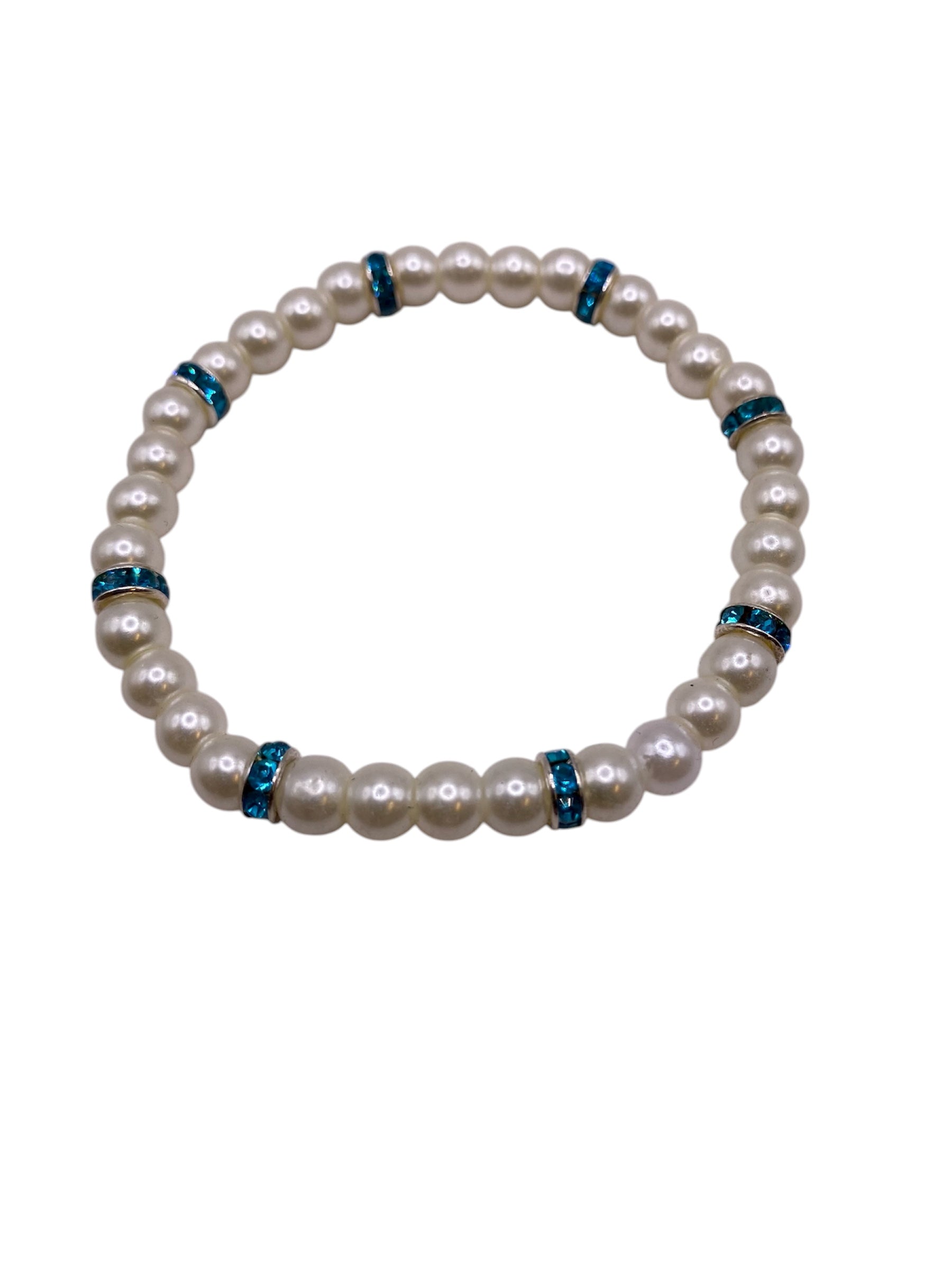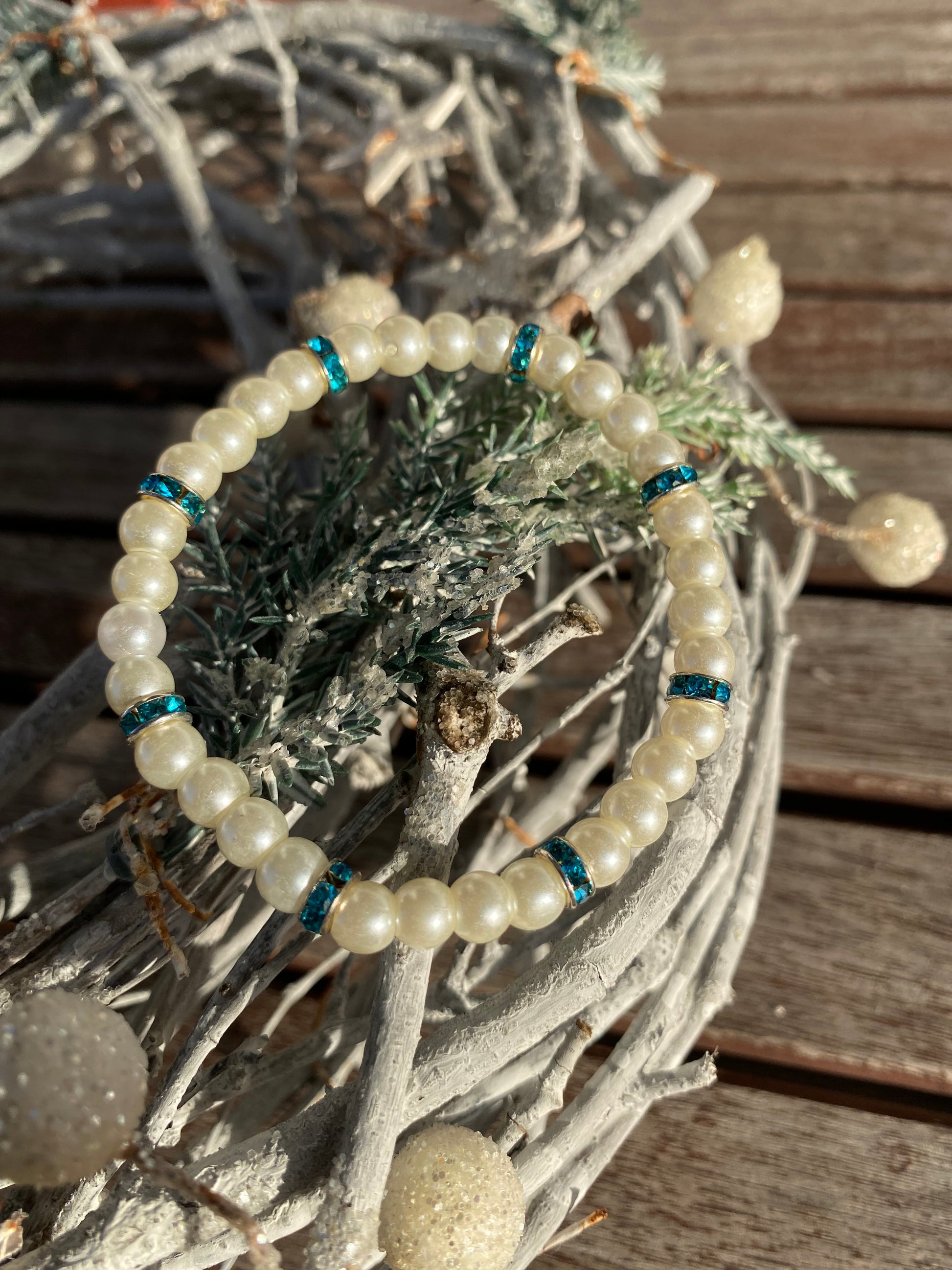 Pärlarmband med vita glaspärlor och turkosa strasstenar