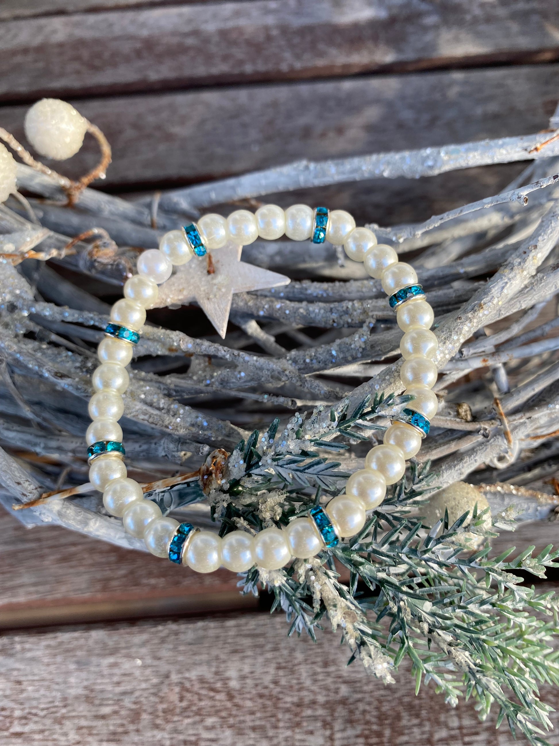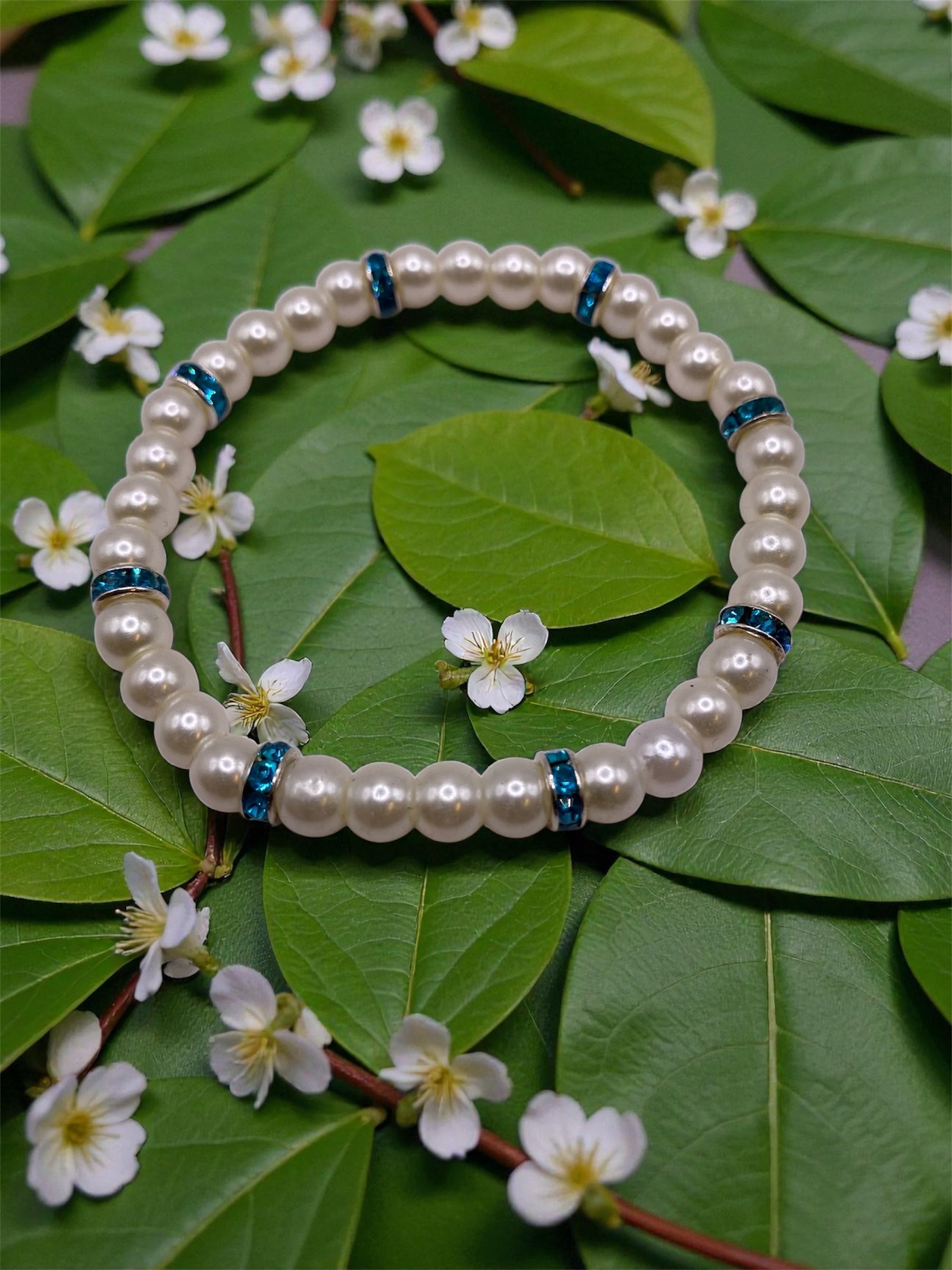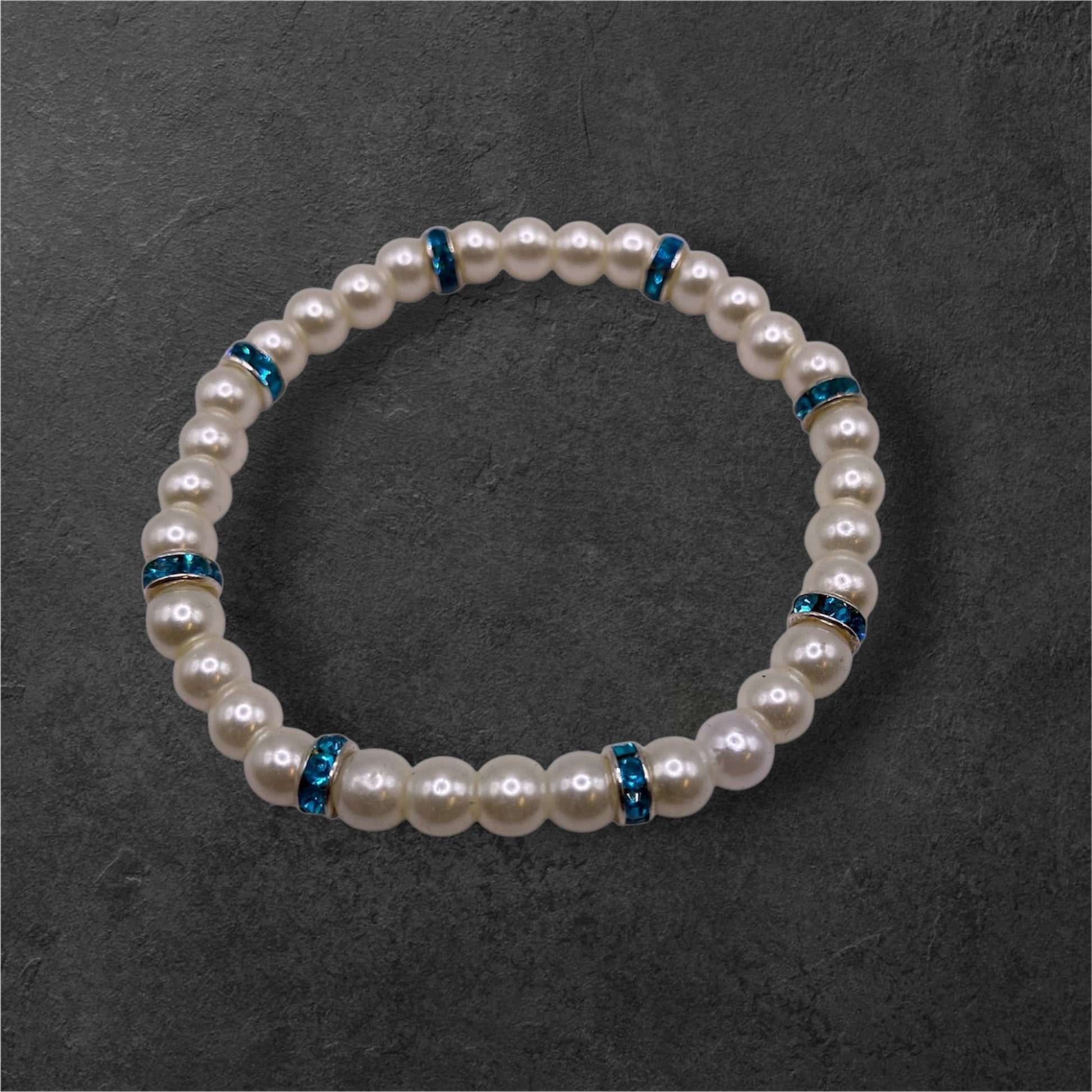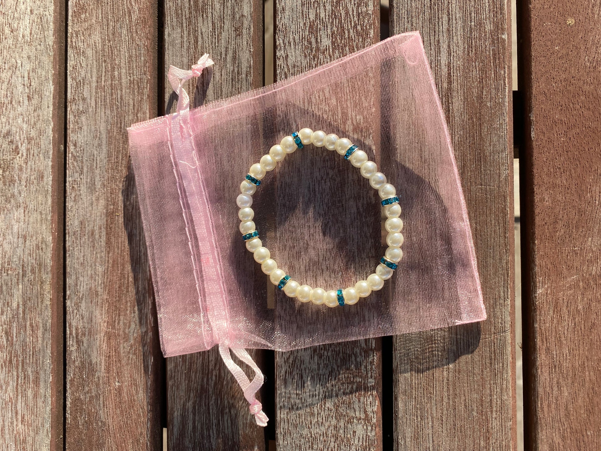 Pärlarmband med vita glaspärlor och turkosa strasstenar