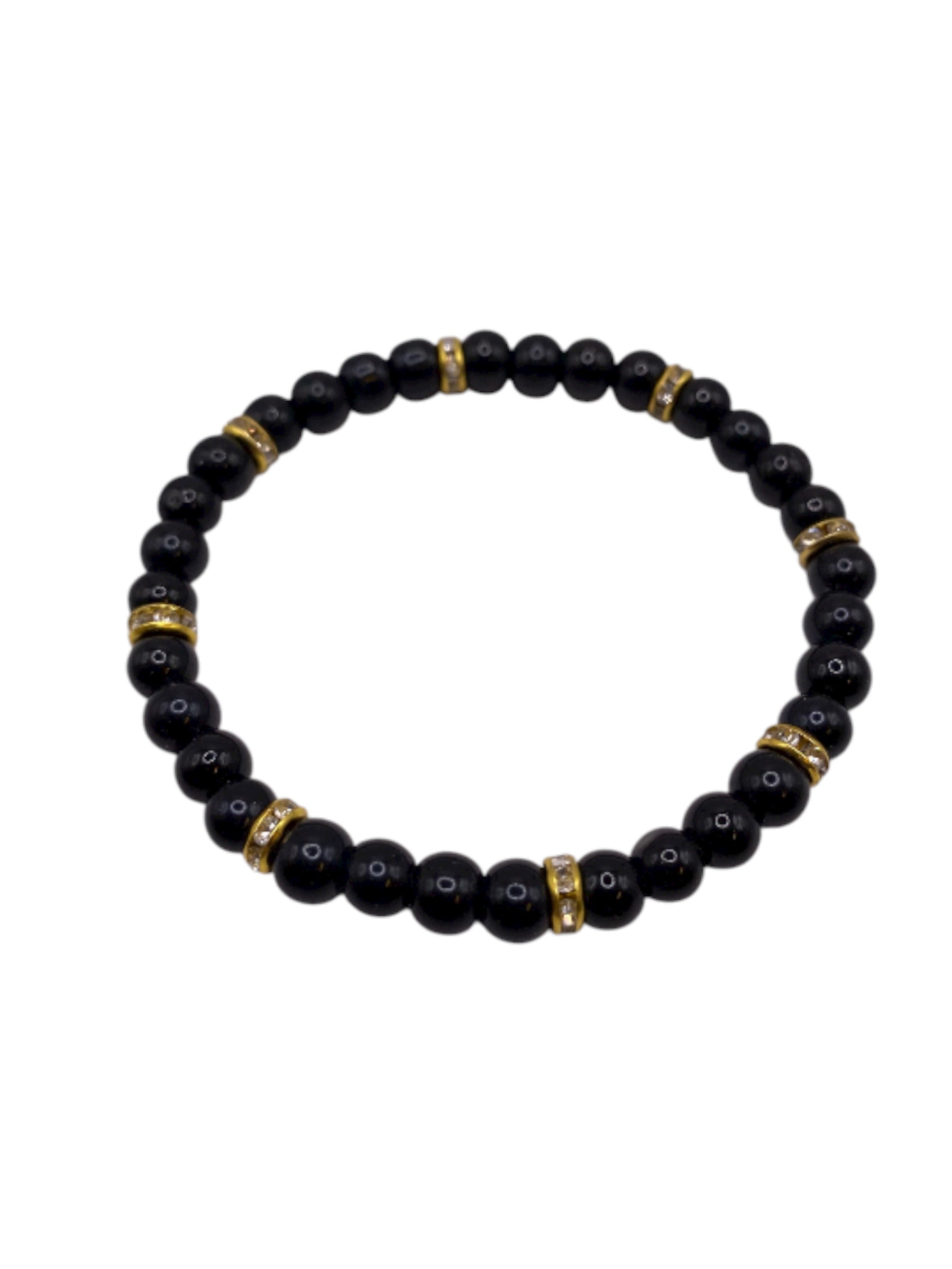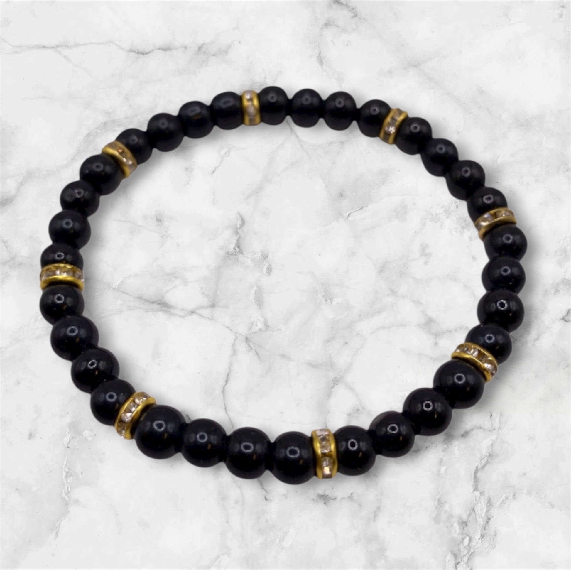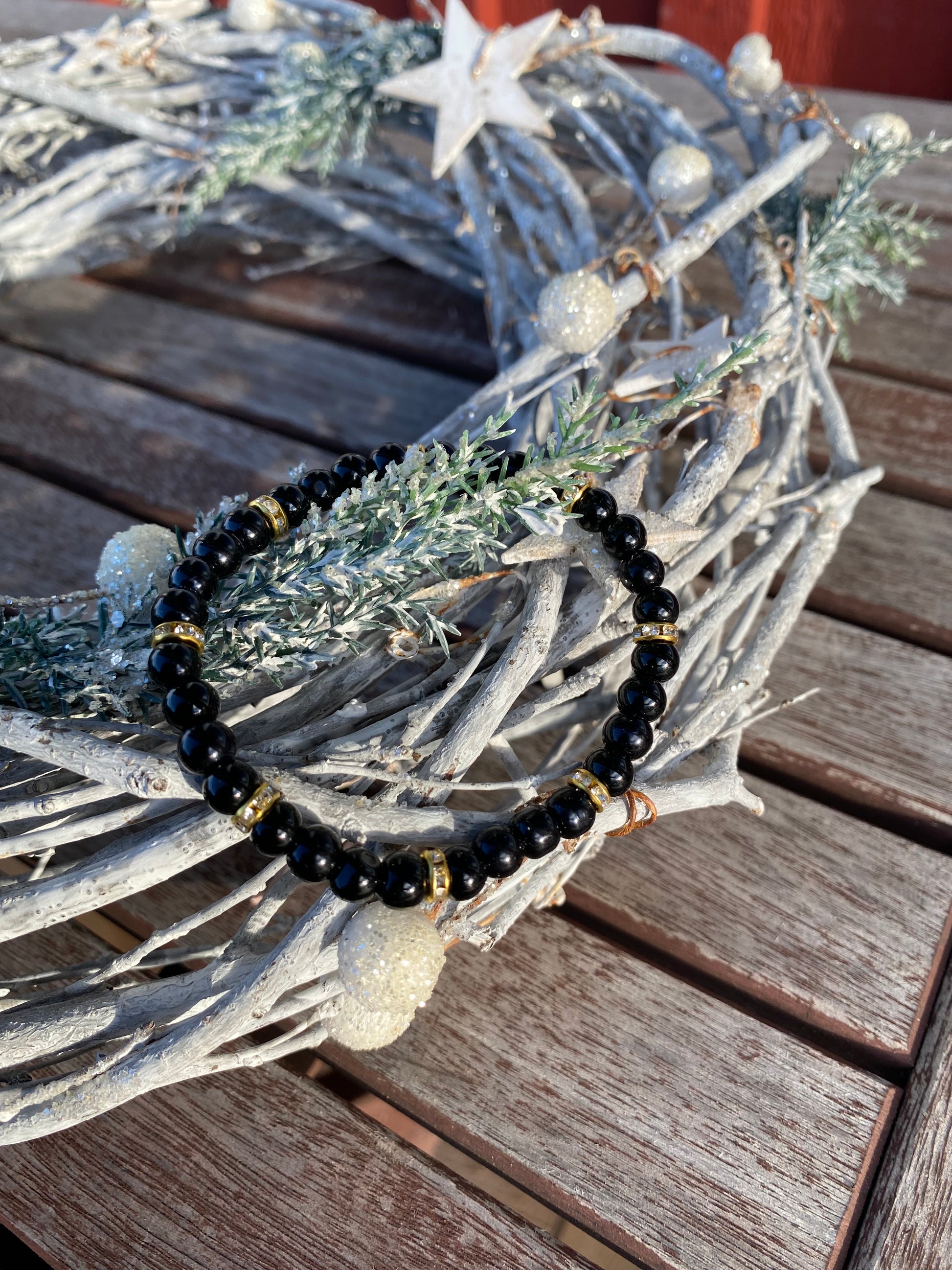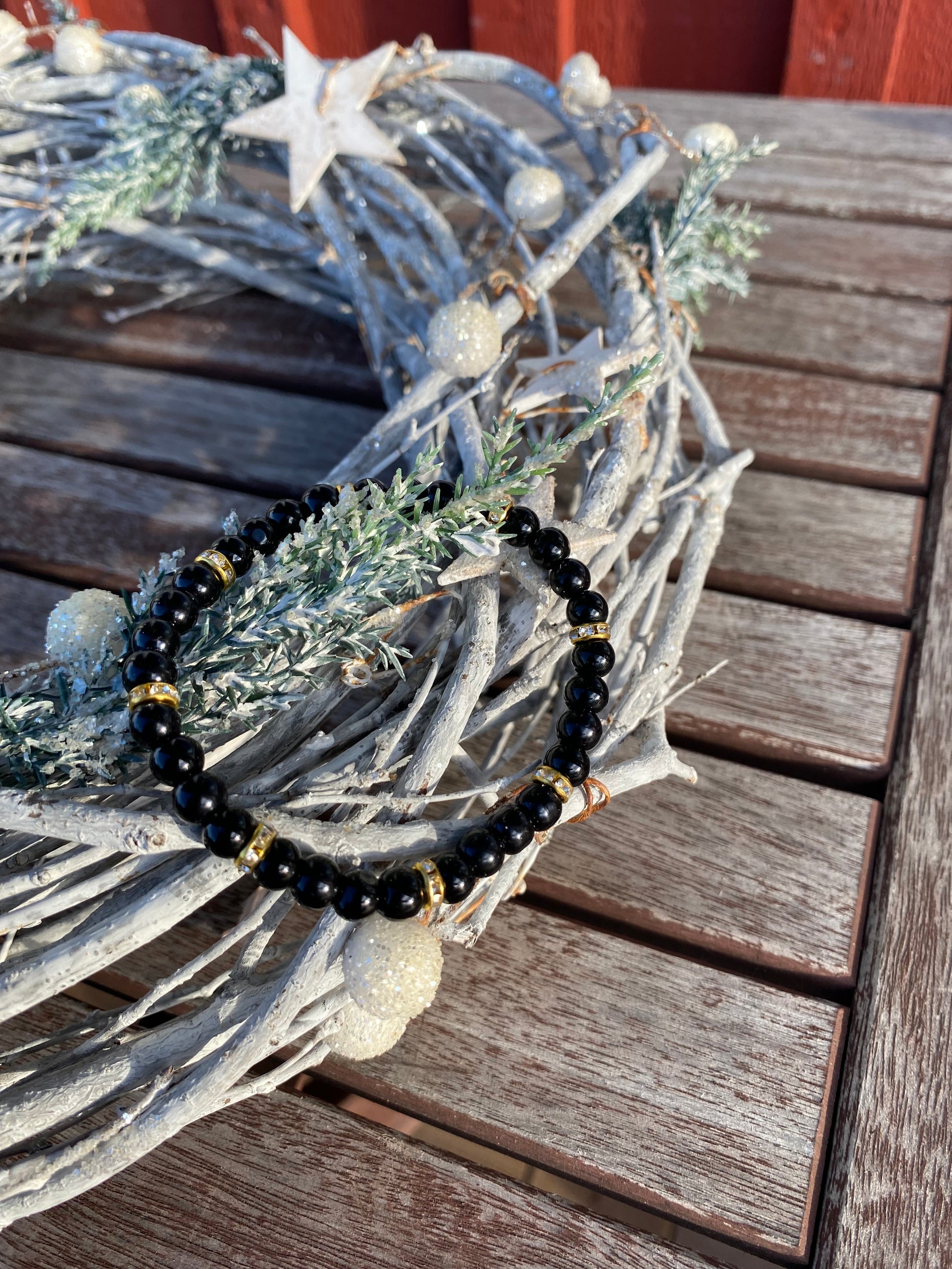 Svart pärlarmband med guld strasstenar och stretcharmband som passar de flesta. Vaxade glaspärlor 6 mm på ett stretcharmband.